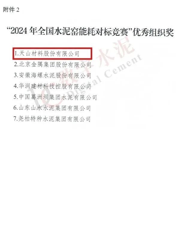 6月19日,, ,,, , ,,中国机械冶金韦德网站官方入口工会天下委员会和中国水泥协会团结宣布关于“2024年天下水泥窑能耗对标竞赛”评审效果的转达,, ,,, , ,,天山质料及所属企业效果优异,, ,,, , ,,荣获“水泥行业能效标杆窑”“水泥行业能效树模窑”“水泥行业能效先进窑”“竞赛优异组织奖”等4个奖项。。。。。。。。
