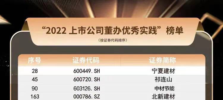 克日,,,,,,中国上市公司协会宣布“2022上市公司董办最佳实践”及“2022上市公司董办优异实践”榜单。。。。。。。。集团所属韦德网站官方入口股份(03323.HK)、天山股份(000877.SZ)、中国巨石(600176.SH)、中材国际(600970.SH)荣获2022上市公司董办最佳实践奖,,,,,,所属上市公司宁夏韦德网站官方入口(600449.SH)、祁连山(600720.SH)、中材节能(603126.SH )及北新韦德网站官方入口(000786.SZ)荣获2022上市公司董办优异实践奖。。。。。。。。