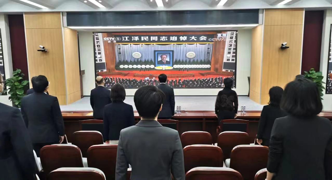上午10时,,,,,,江泽民同志追悼大会最先。。。。。加入整体收看职员全程肃立,,,,,,默哀三分钟,,,,,,认真聆听习近平总书记在追悼大会上所致的悼词,,,,,,深切思念江泽民同志的绚烂业绩和高尚风范。。。。。追悼大会竣事时,,,,,,各人向江泽民同志遗像深深三鞠躬。。。。。
